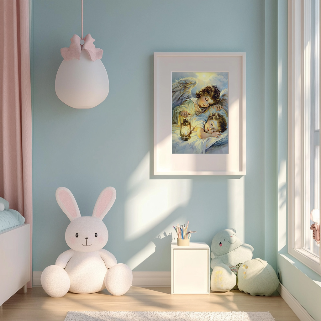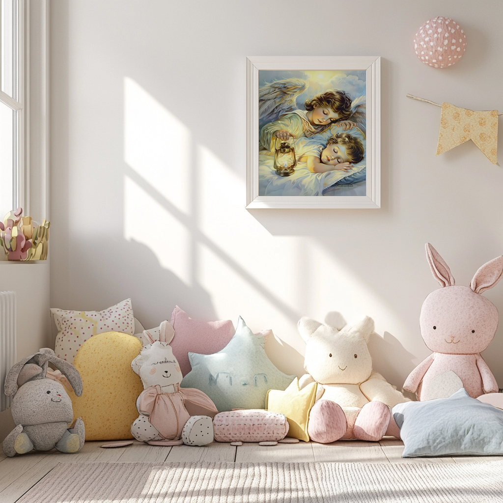 Ten piękny obraz przedstawia czułego anioła Stróża, który troskliwie pochyla się nad śpiącym dzieckiem, trzymając w ręku delikatnie świecącą latarnie. Scena symbolizuje ochronę i bezpieczeństwo, jakie niesie ze sobą Anioł Stróż. Obraz emanuje spokojem i harmonią, odpowiedni do dziecięcego pokoju, tworząc atmosferę ciepła i bezpieczeństwa. Idealny prezent na chrzest, komunię, czy narodziny dziecka.