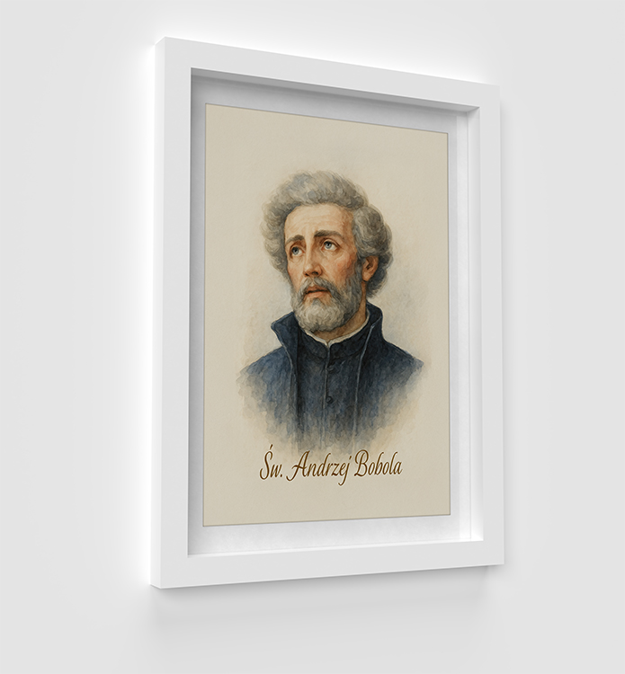 Wzruszający portret Świętego Andrzeja Boboli – patrona Polski, męczennika i gorliwego misjonarza – przedstawiony w wyjątkowej, klasycznej stylistyce malarstwa akwarelowego. Obraz emanuje duchową głębią, wewnętrznym spokojem i majestatycznym pięknem. Subtelna paleta barw – zgaszone błękity, ciepłe beże i głębokie cienie – nadaje dziełu wyjątkową elegancję i ponadczasowość.