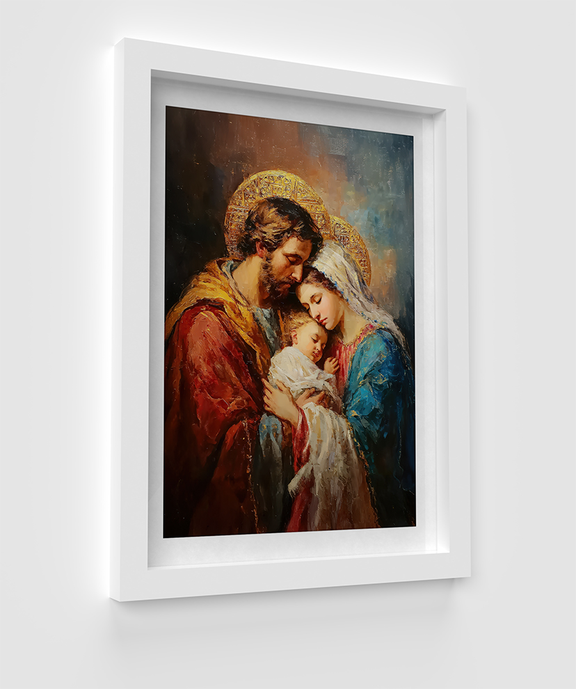 Wprowadź do swojego wnętrza niezwykłą atmosferę sacrum dzięki wyjątkowemu dziełu sztuki, jakim jest obraz „Święta Rodzina”. To kompozycja, która emanuje ciepłem, miłością i spokojem. Centralnym punktem dzieła jest Maria, Józef i Dzieciątko Jezus – przedstawieni w pełnym miłości uścisku, który przypomina o sile rodzinnych więzi.